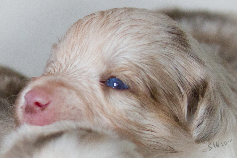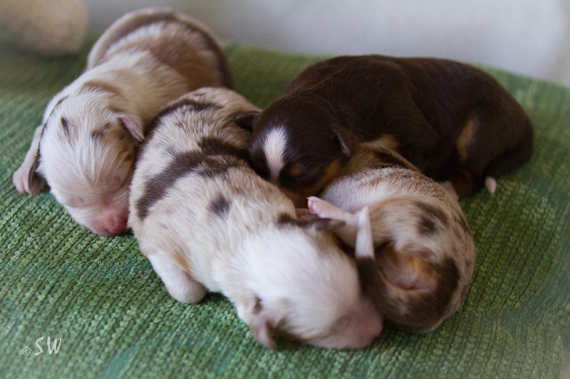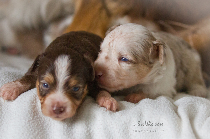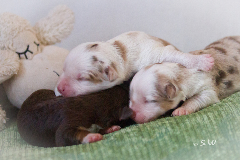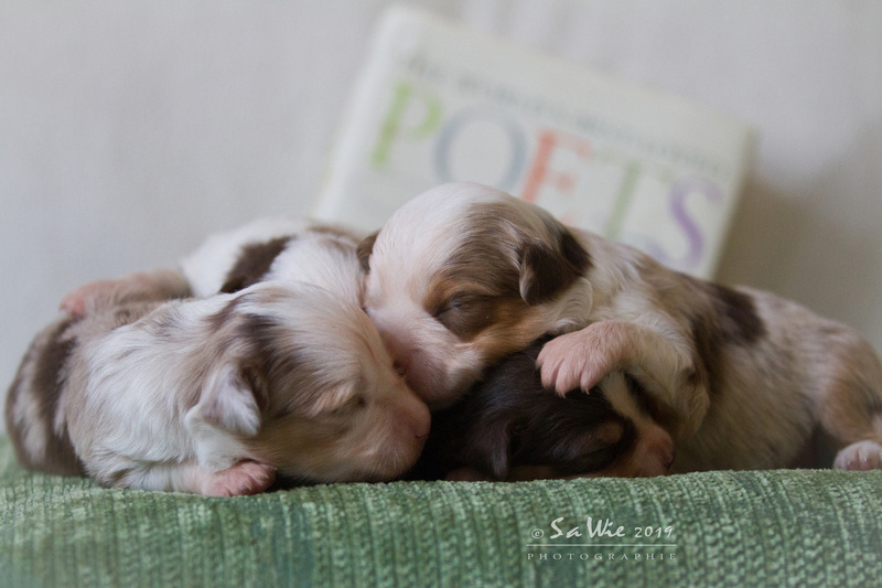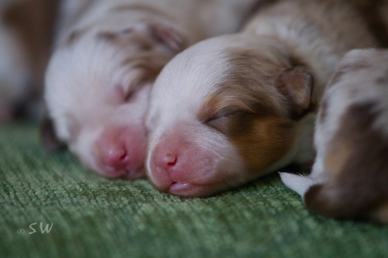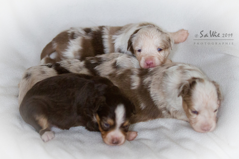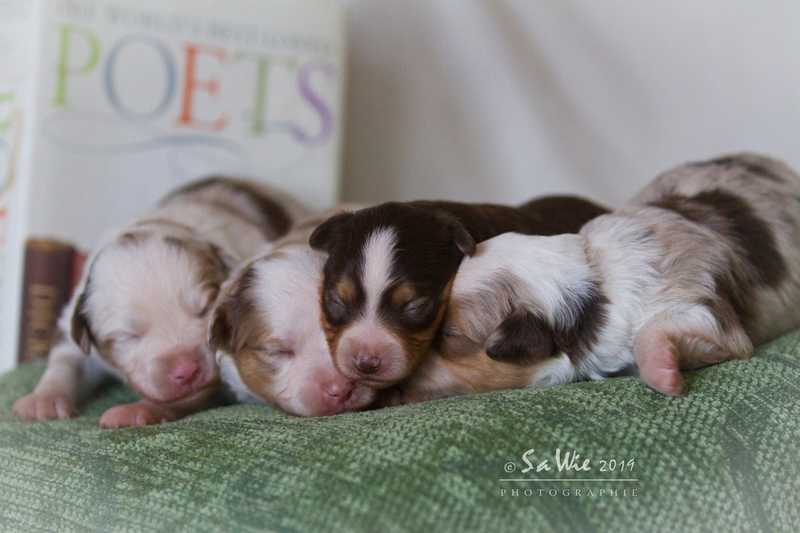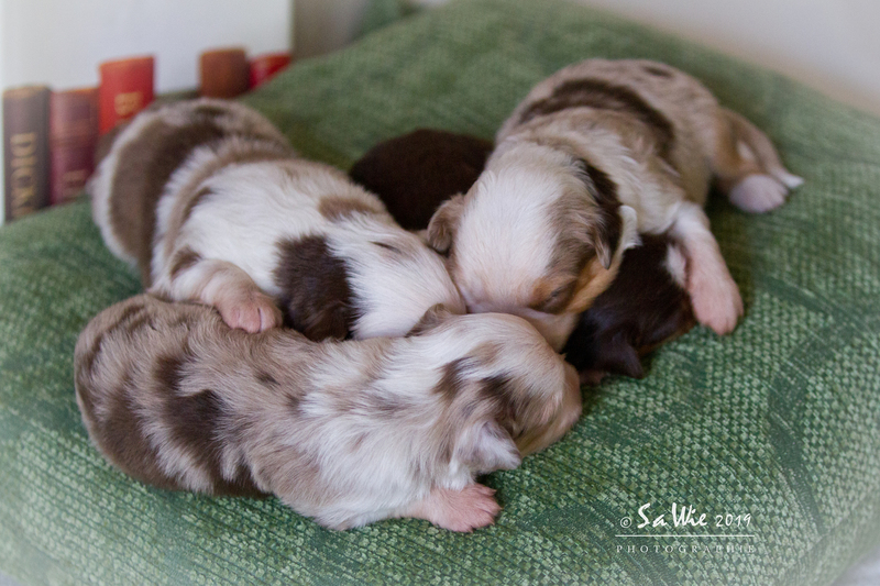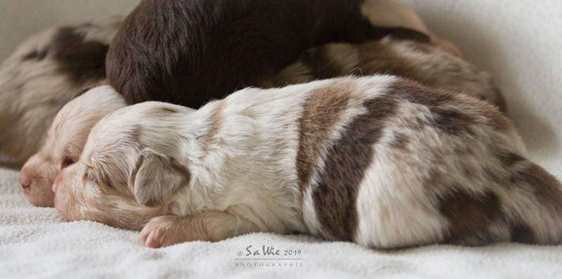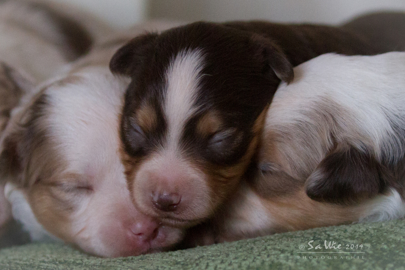 Eine Woche sind die Welpen nun. Alle sind gesund und munter und Sansa ist eine tolle Mama. Wir sind ganz begeistert, dass dieser Wurf so quietschbunt geworden ist. Aber auch der tri Junge muss sich nicht verstecken. Er hat tolle kupferfarbene Abzeichen und wir sind gespannt ob er blaue Augen bekommt wie seine Eltern.
