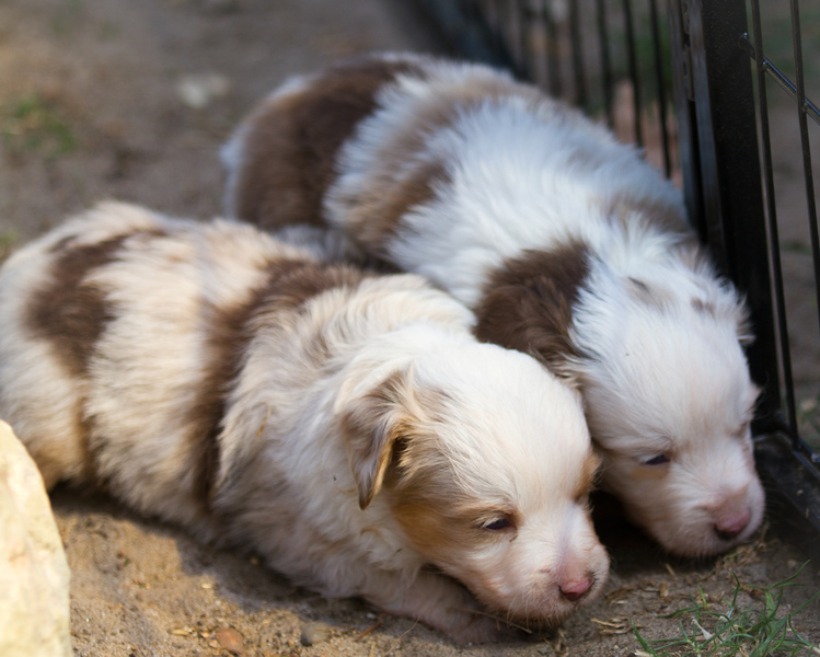 3,5 Wochen. Die Welpchen waren zum ersten Mal draußen. An der Begeisterung müssen wir noch arbeiten. Im Garten haben wir einen großen Welpenauslauf aufgebaut. Aber soviel Freiheit kann auch schonmal unheimlich sein. Mit viel mehr Begeisterung wurde das erste Welpenfutter aufgenommen. Jeden Tag werden sie mobiler und kuscheln wird nun täglich eingefordert. Die Jungs schlafen nachts, das Mädel meint nachts kann man sich ruhig auch bemerkbar machen. Wenn dann alle im Haus wach sind kuschelt man sich an die Brüder und schläft selig weiter...